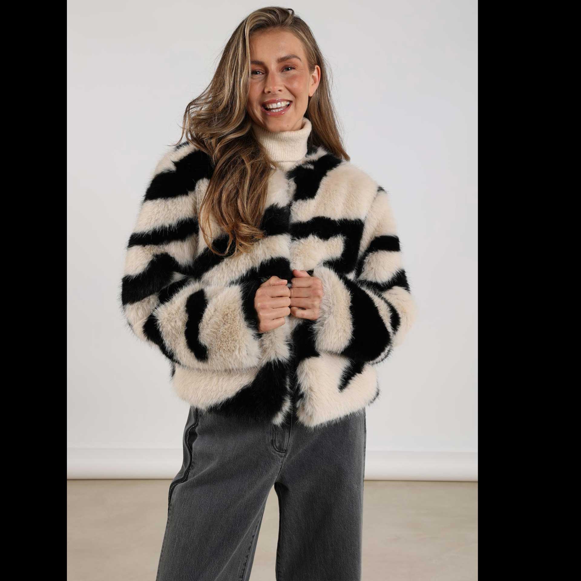 Dit jasje heeft lange mouwen, een opstaande kraag en een ritssluiting aan de voorkant.