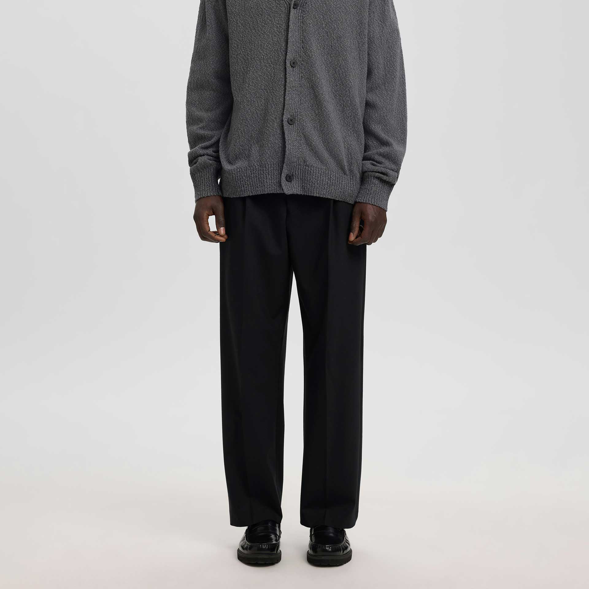 Deze broek heeft een knoop- en ritssluiting en riemlussen.