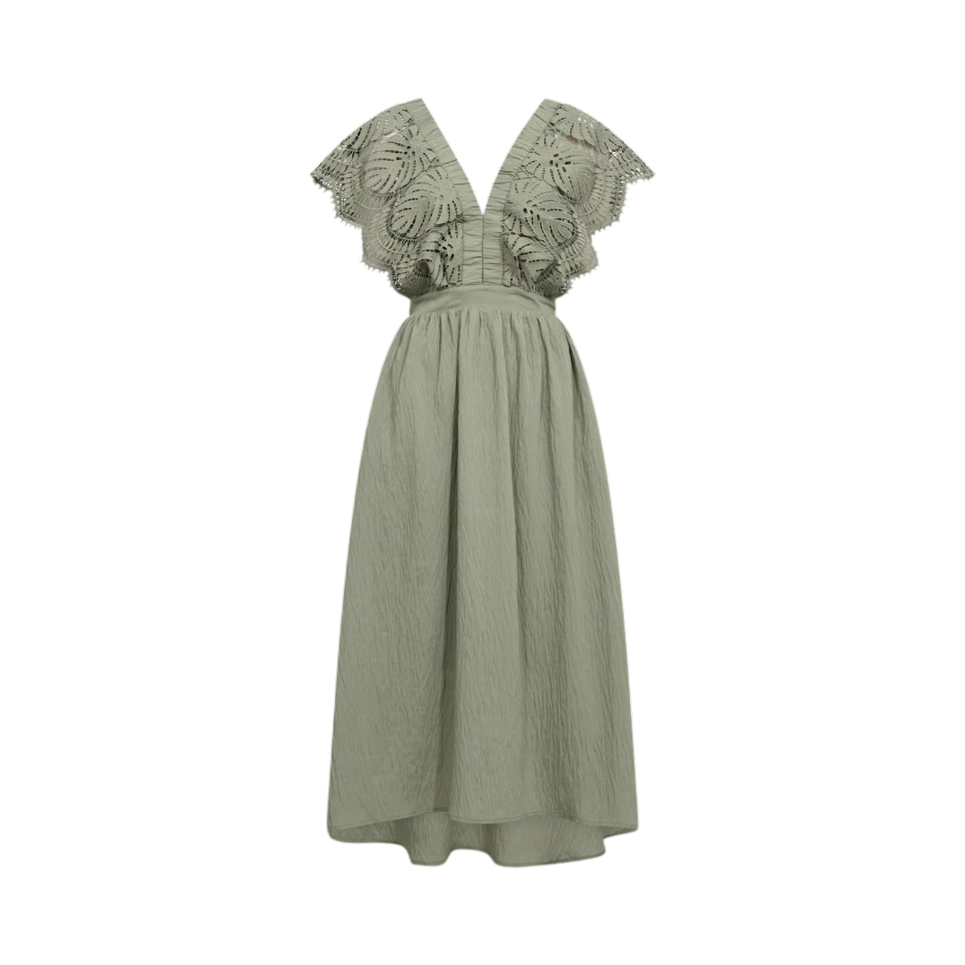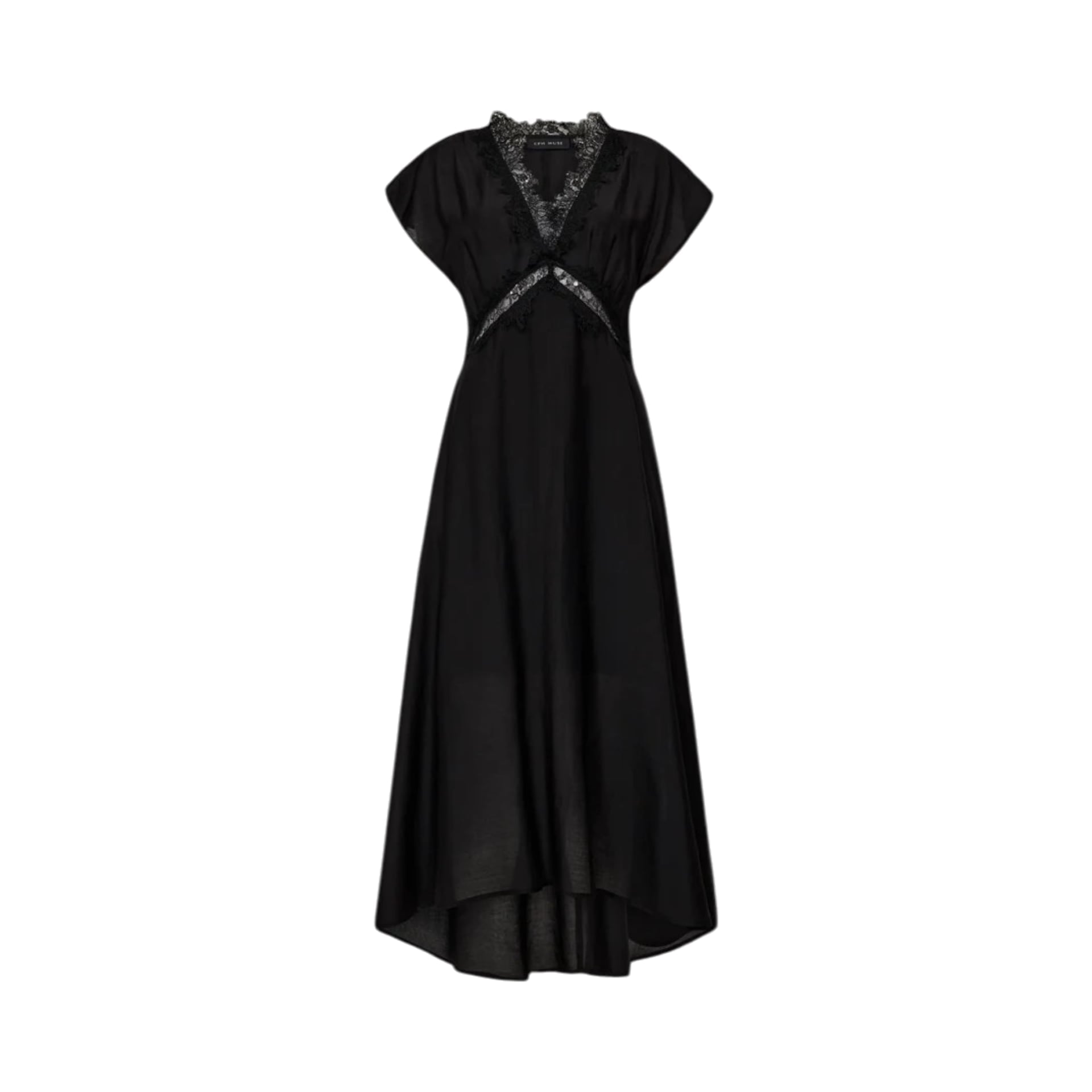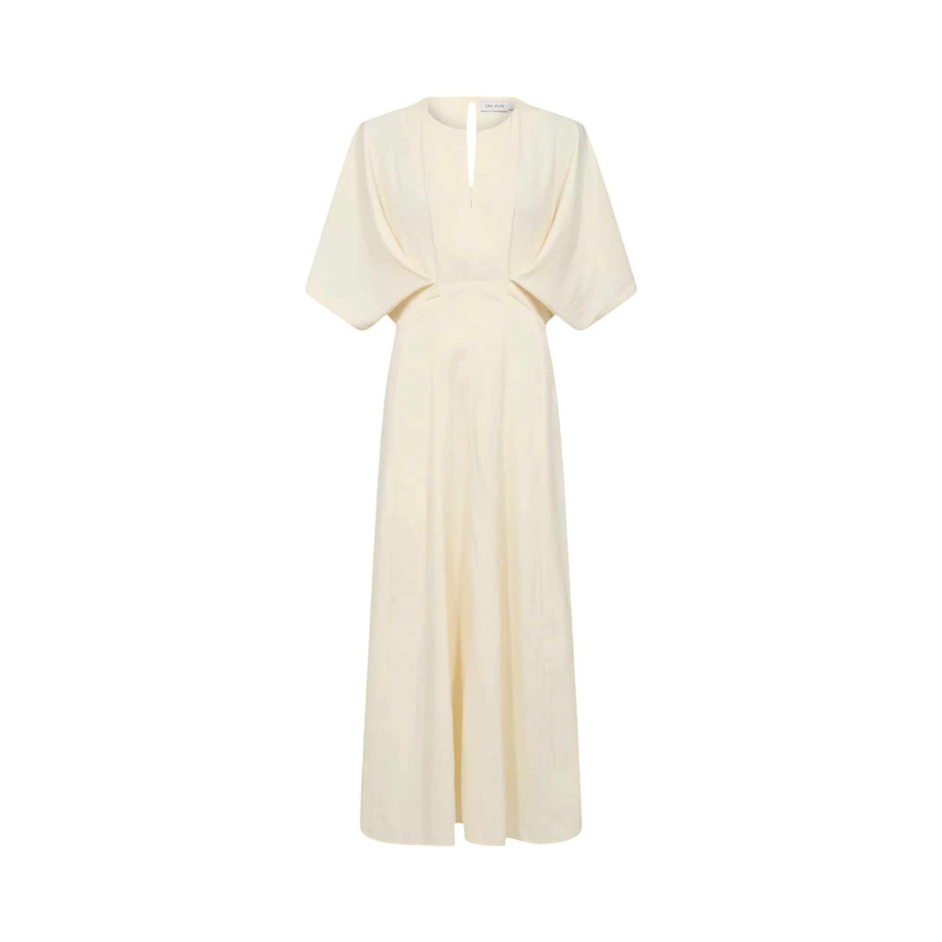 Deze jurk heeft korte mouwen, een v-hals en een knoopsluiting aan de achterkant.