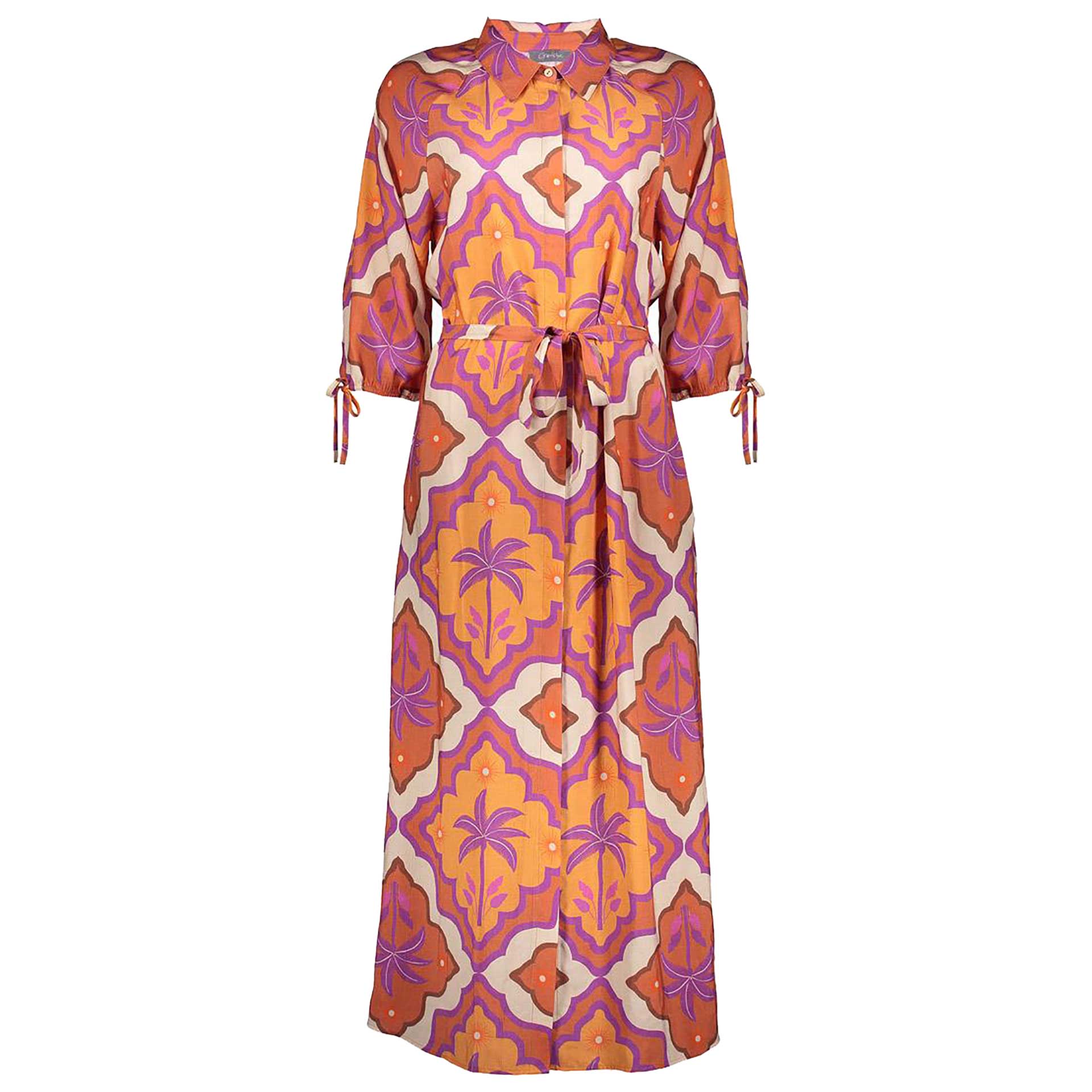 Deze jurk heeft driekwart mouwen, een v-hals, een knoopsluiting aan de voorkant en een all-over patroon.