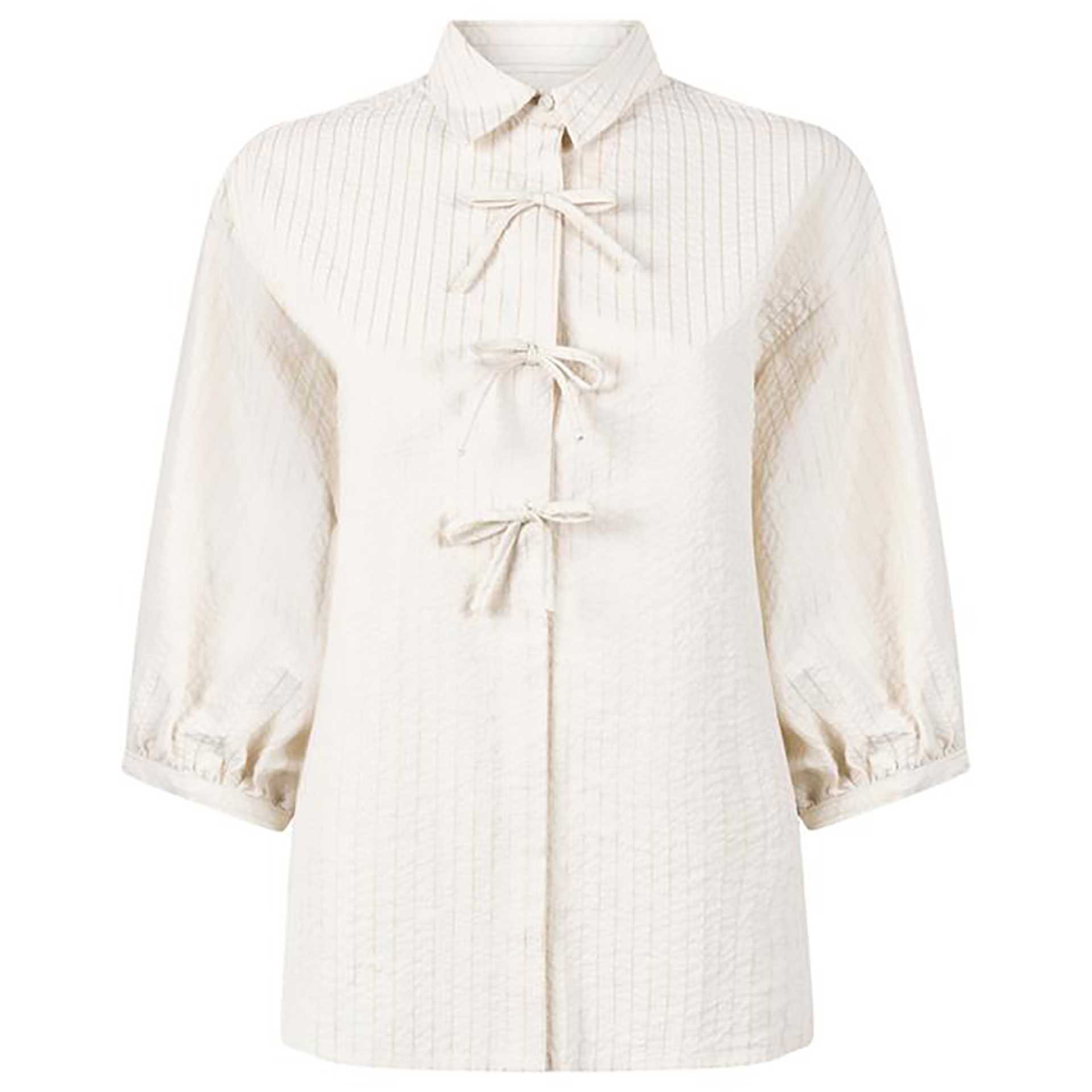 Deze blouse heeft een V-hals en driekwart mouwen met speels detail aan de uiteinden. Dit is een comfortabele en stijlvolle b… Volledige productomschrijving...