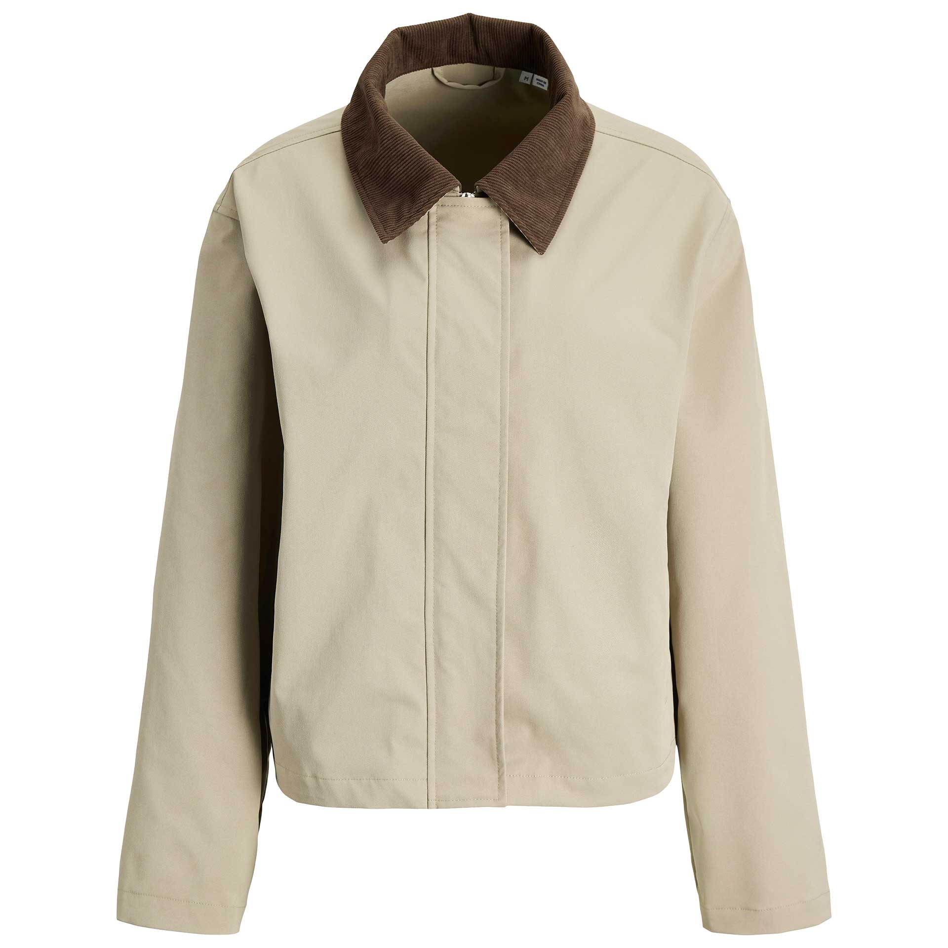 Dit jasje heeft lange mouwen, een opstaande kraag en een ritssluiting aan de voorkant.