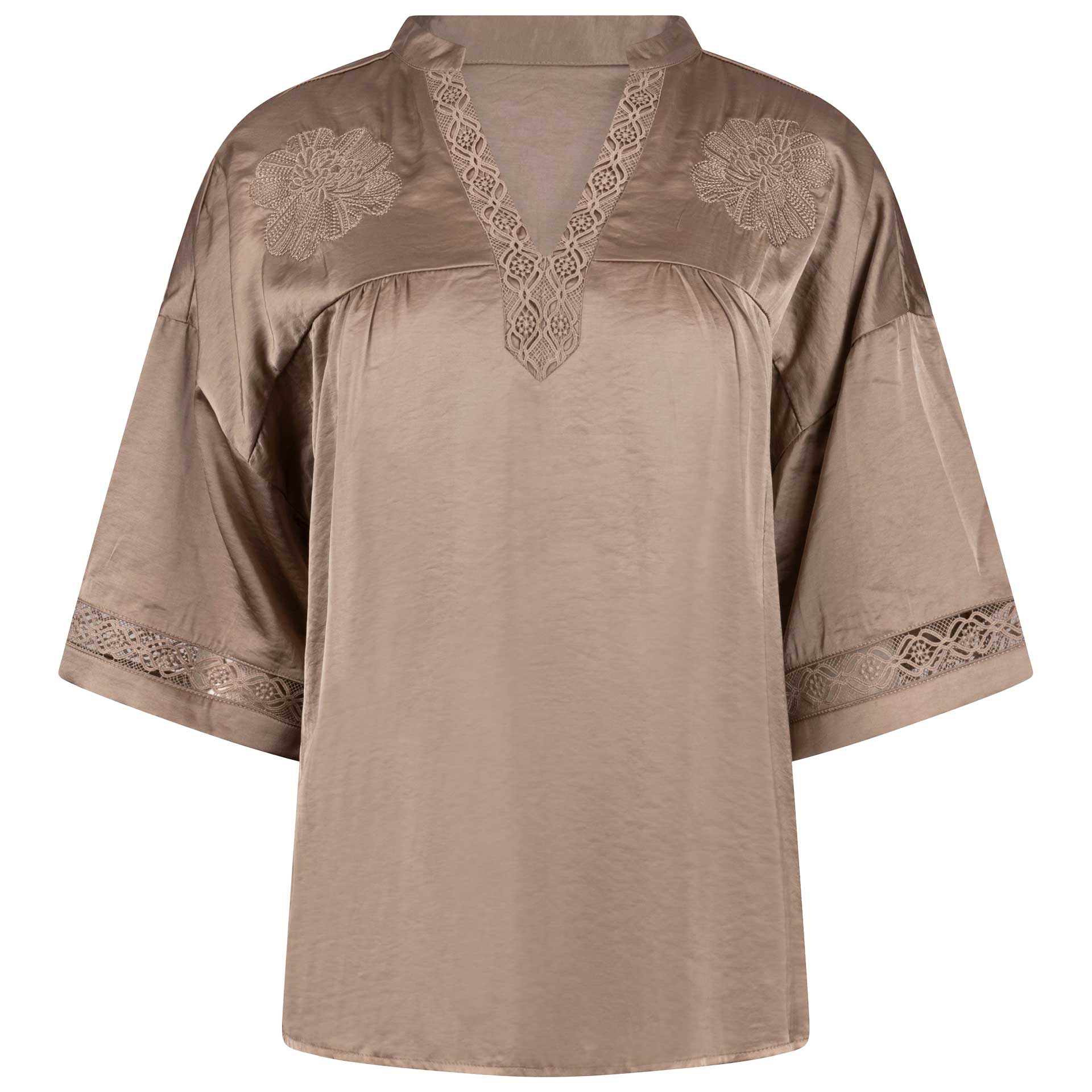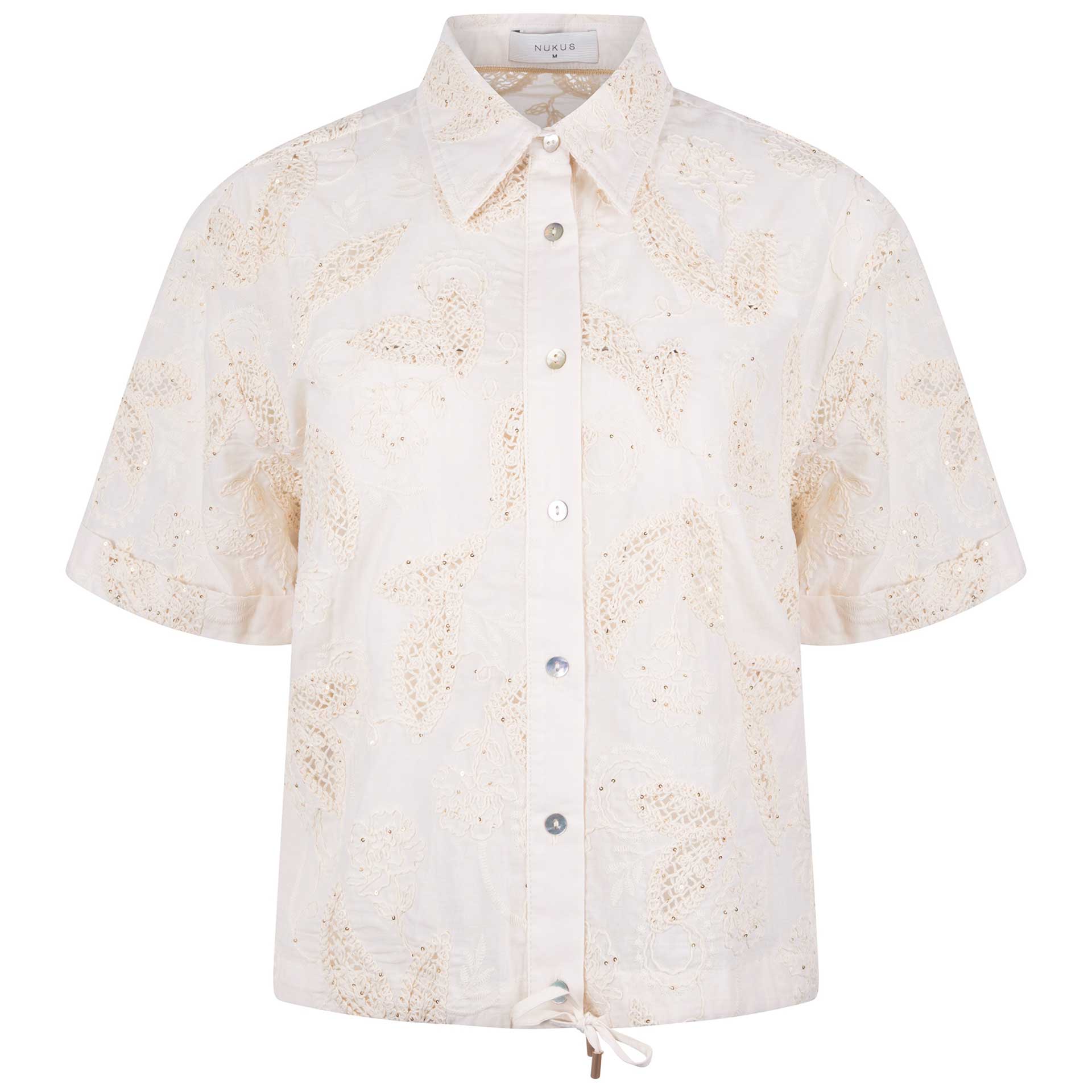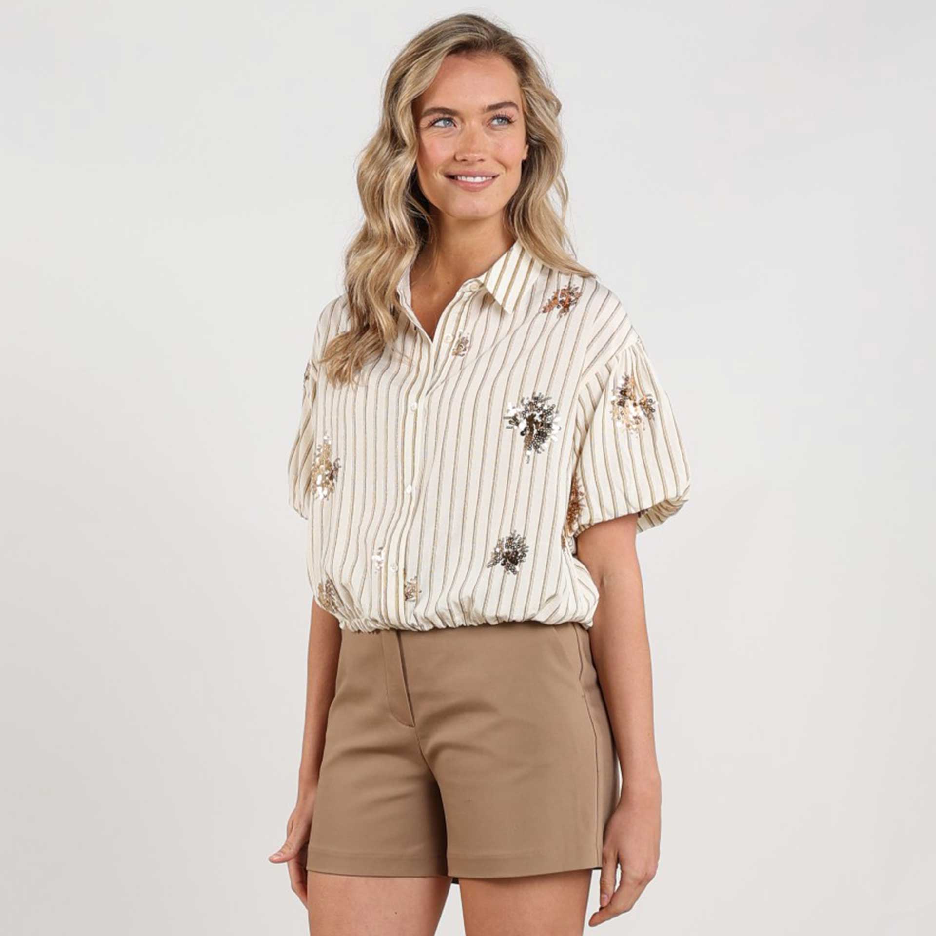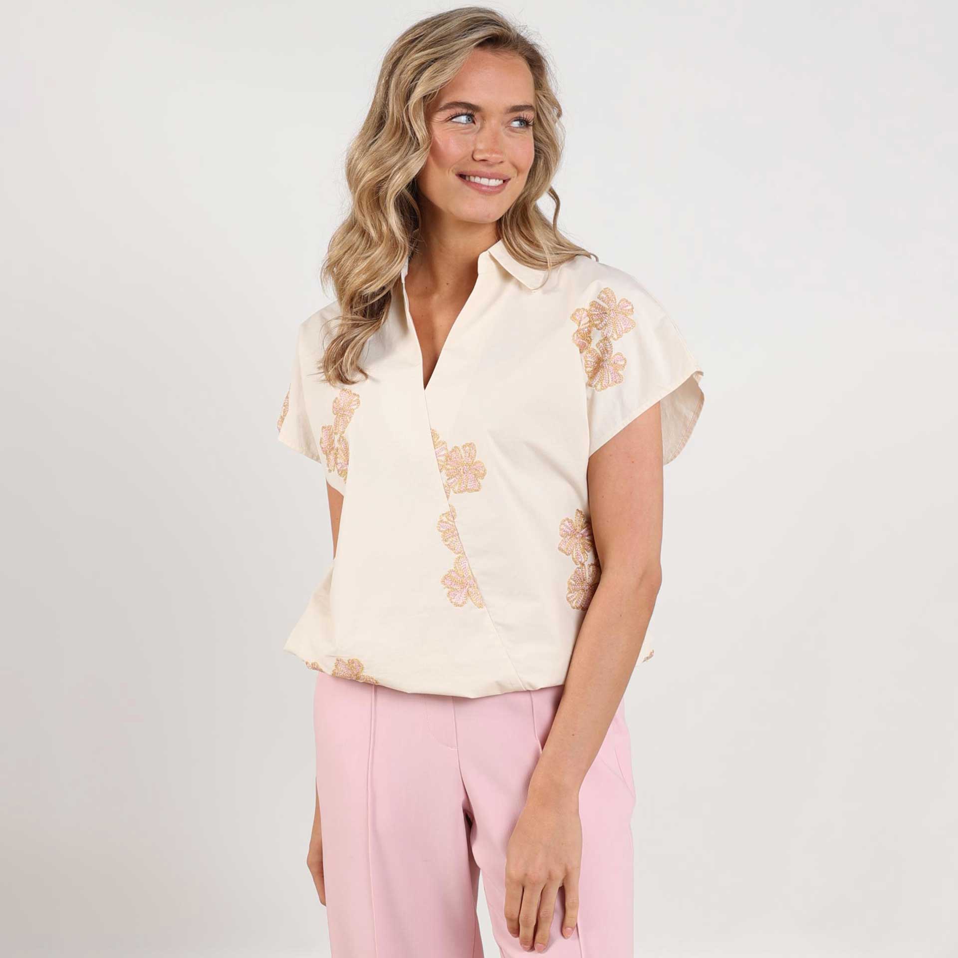 Deze blouse heeft korte mouwen, een kraag en een knoopsluiting aan de voorkant.