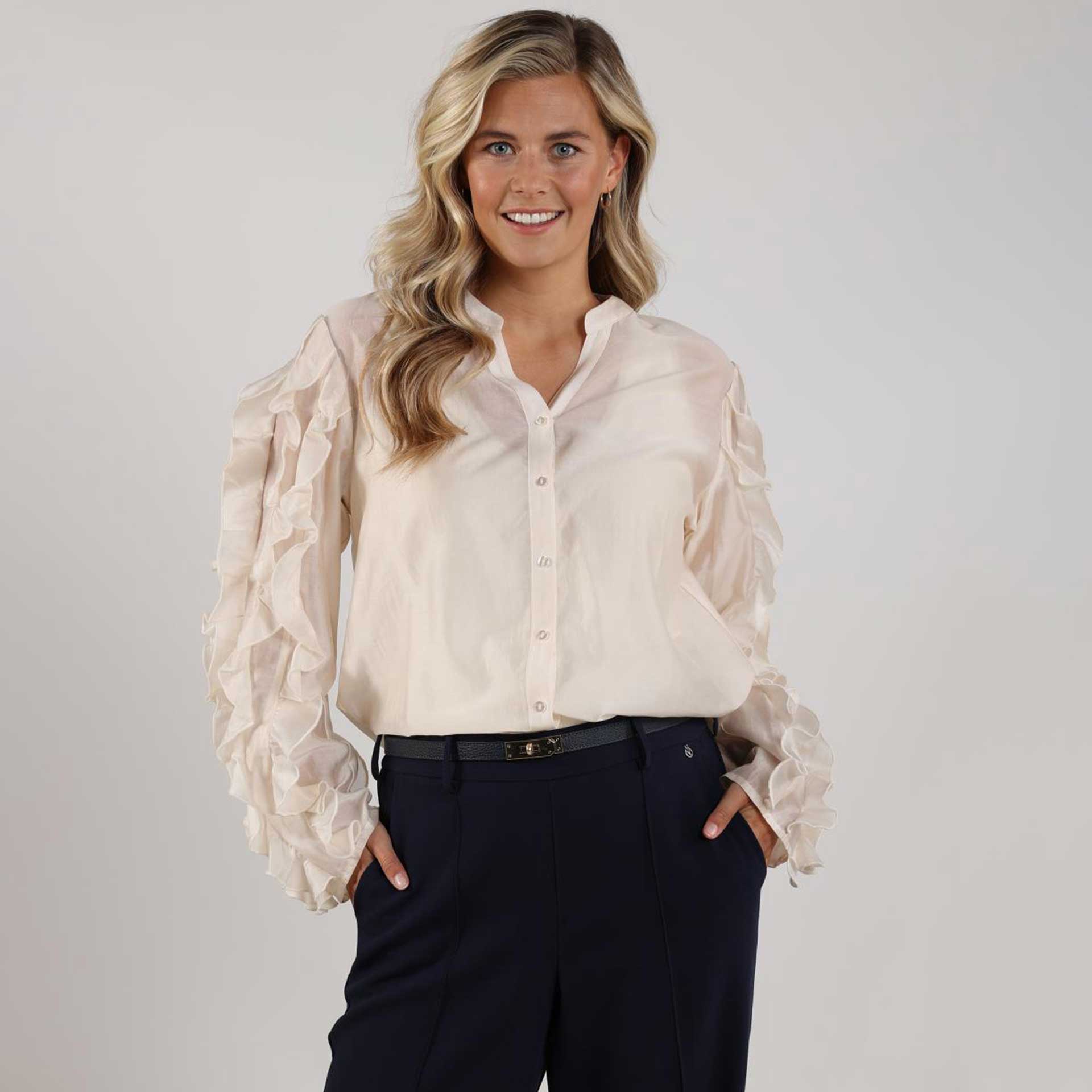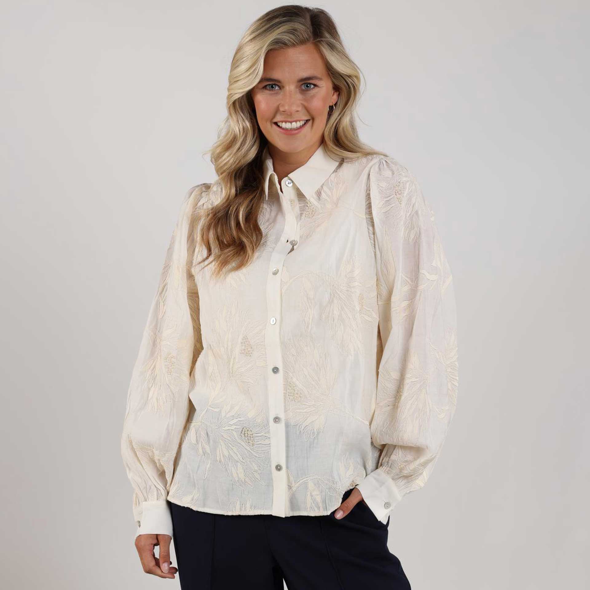 Deze blouse heeft lange mouwen, een kraag en een knoopsluiting aan de voorkant.