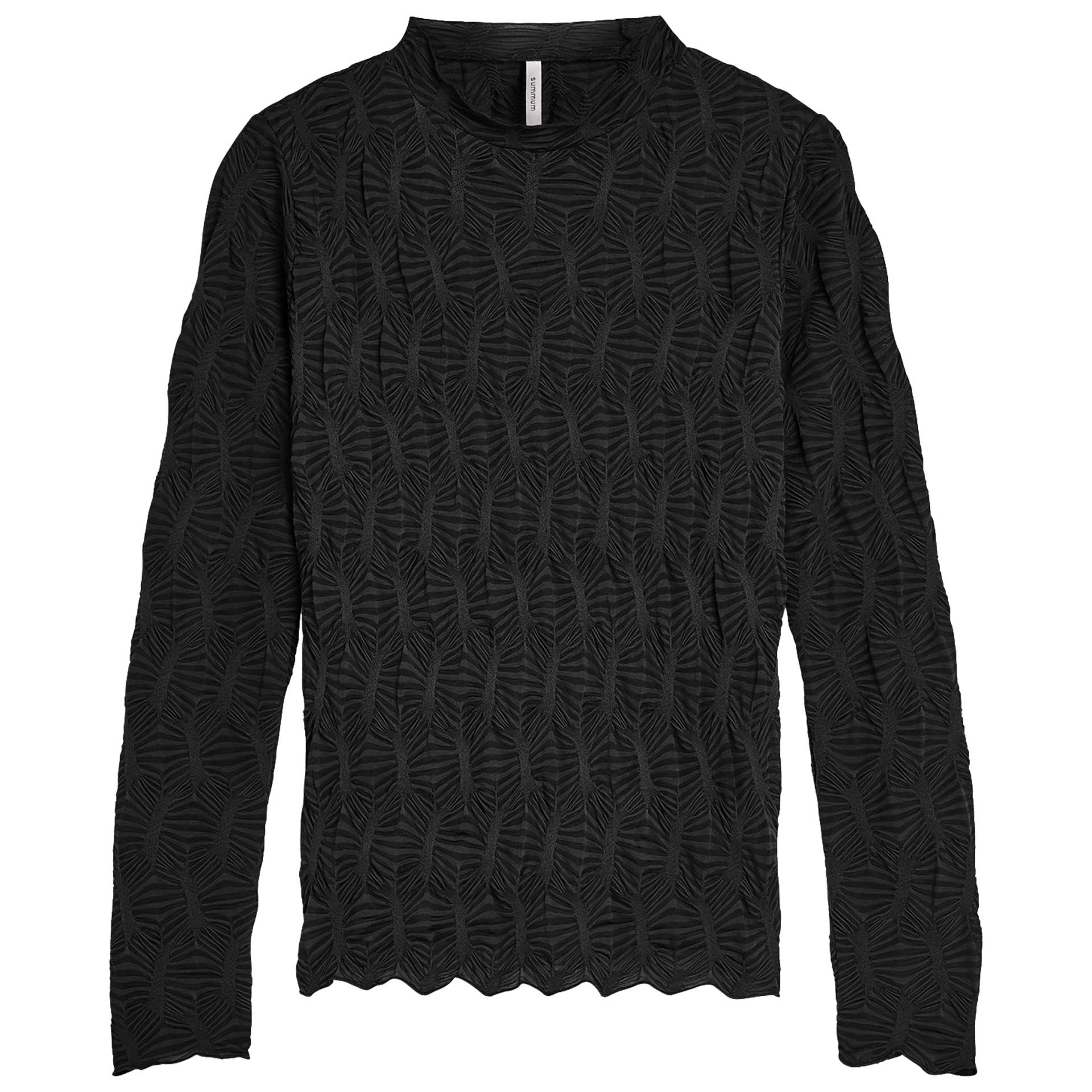 Dit truitje heeft lange mouwen, een opstaande kraag en een all-over glitter print.
