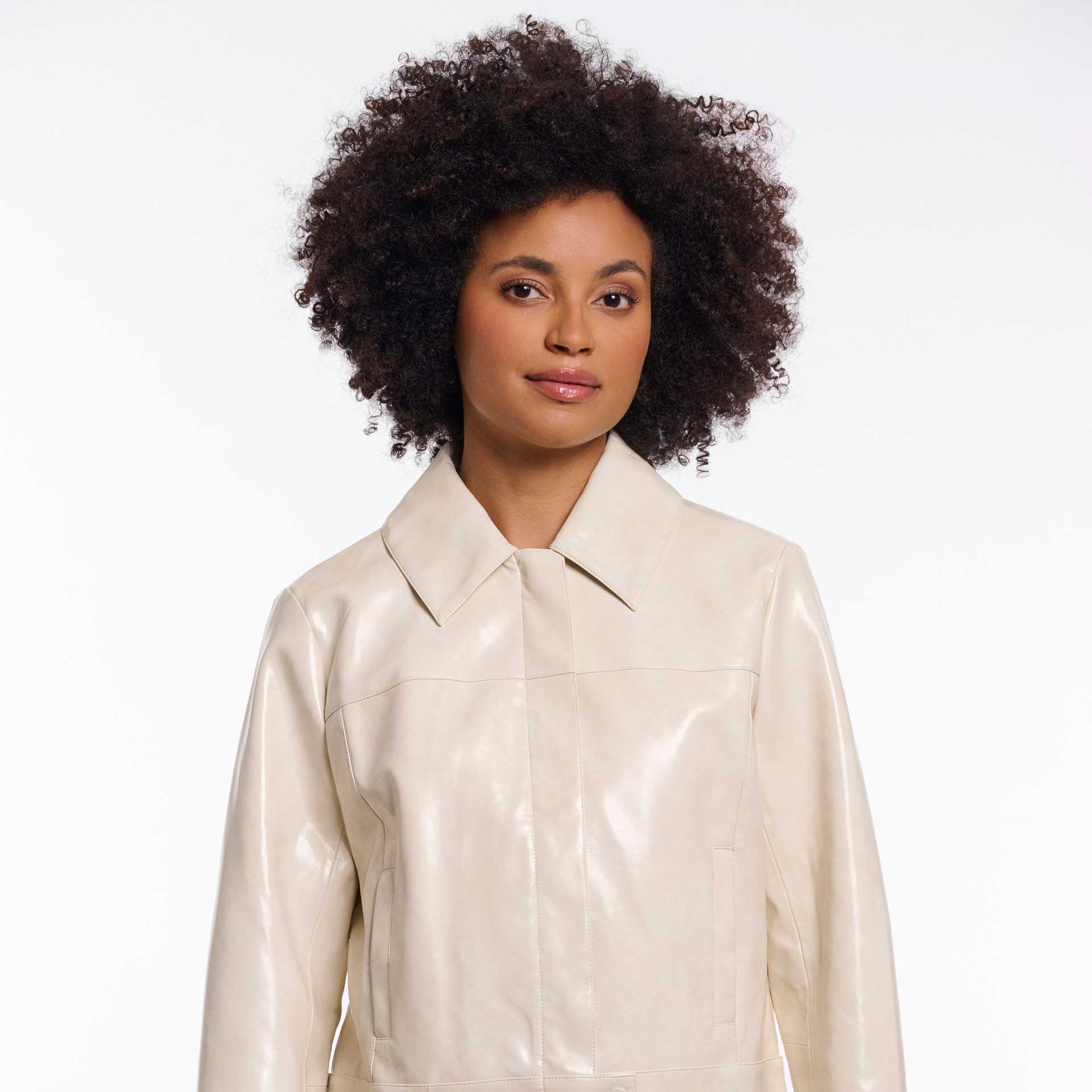 Dit jasje heeft lange mouwen, een opstaande kraag en een drukknoopsluiting aan de voorkant.